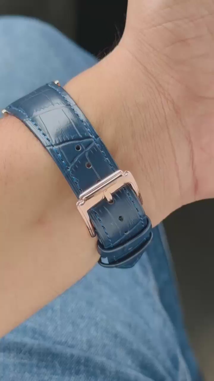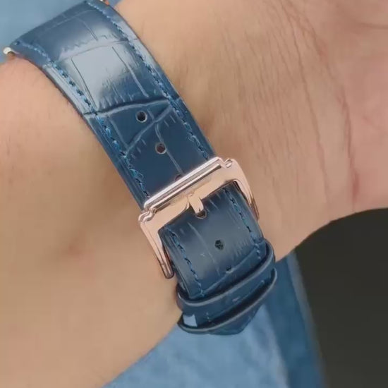 A genuine blue leather strap complements the design, offering comfort and luxury.