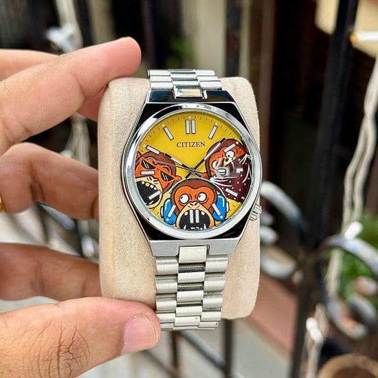 The Citizen "Wise Guys Concept" – Limited Art Edition is a distinctive collectible watch designed for those who appreciate street art’s rebellious spirit and premium watchmaking craftsmanship. This edition fuses the iconic Citizen Tsuyosa stainless steel platform with a hand-painted dial featuring the "Three Wise Monkeys"—a symbol of wit, wisdom, and playful rebellion. Each piece is part of a strictly limited global series.