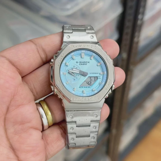 The Casio G-Shock GM-2110D-2ADR is a premium analog-digital watch in the 7AA collection, known for its sophisticated metal construction coupled with rugged G-Shock durability. With a sleek silver metal bezel, stainless steel band, and a colorful dial, it blends elegance and toughness perfectly.