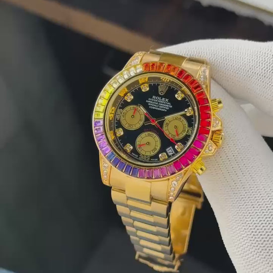 The Rolex Rainbow Daytona is a modern cult classic that blends professional chronograph functionality with vibrant luxury. This men’s watch from the 7AA Premium Collection features a striking 42mm gold stainless steel dial with a rainbow-colored bezel, making it a bold and classic choice for any wrist.