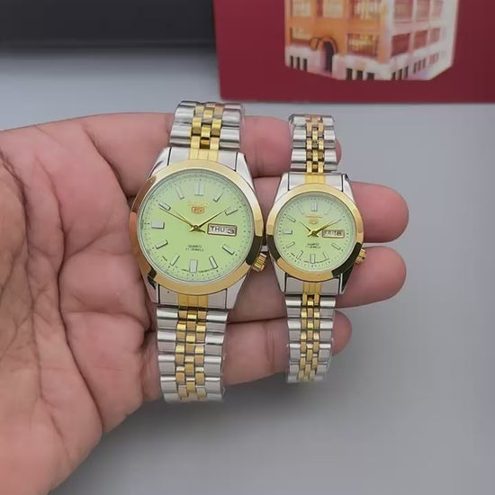 The Seiko Couple Watch from the 7A High-Quality Collection offers an elegant and durable wristwatch set designed for couples who value both style and precision. Featuring a stainless steel chain with an original lock and a robust construction, the watches come with scratch-resistant sapphire glass for clear, lasting visibility.